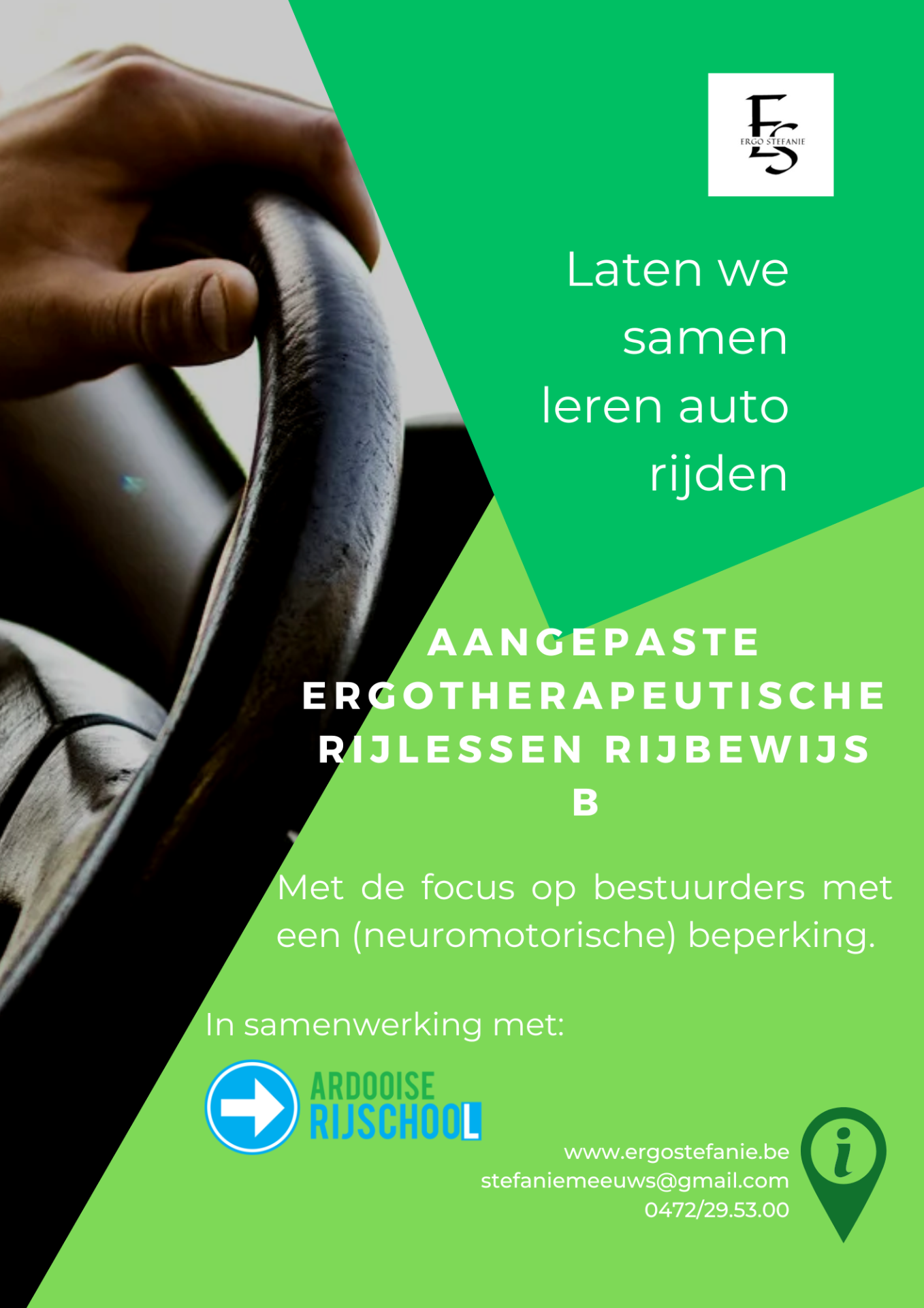 De lessen die je van me krijgt gebeuren zijn ergotherapeutisch en op maat gemaakt maar ik werk steeds in samenwerking met de Ardoose Rijschool.